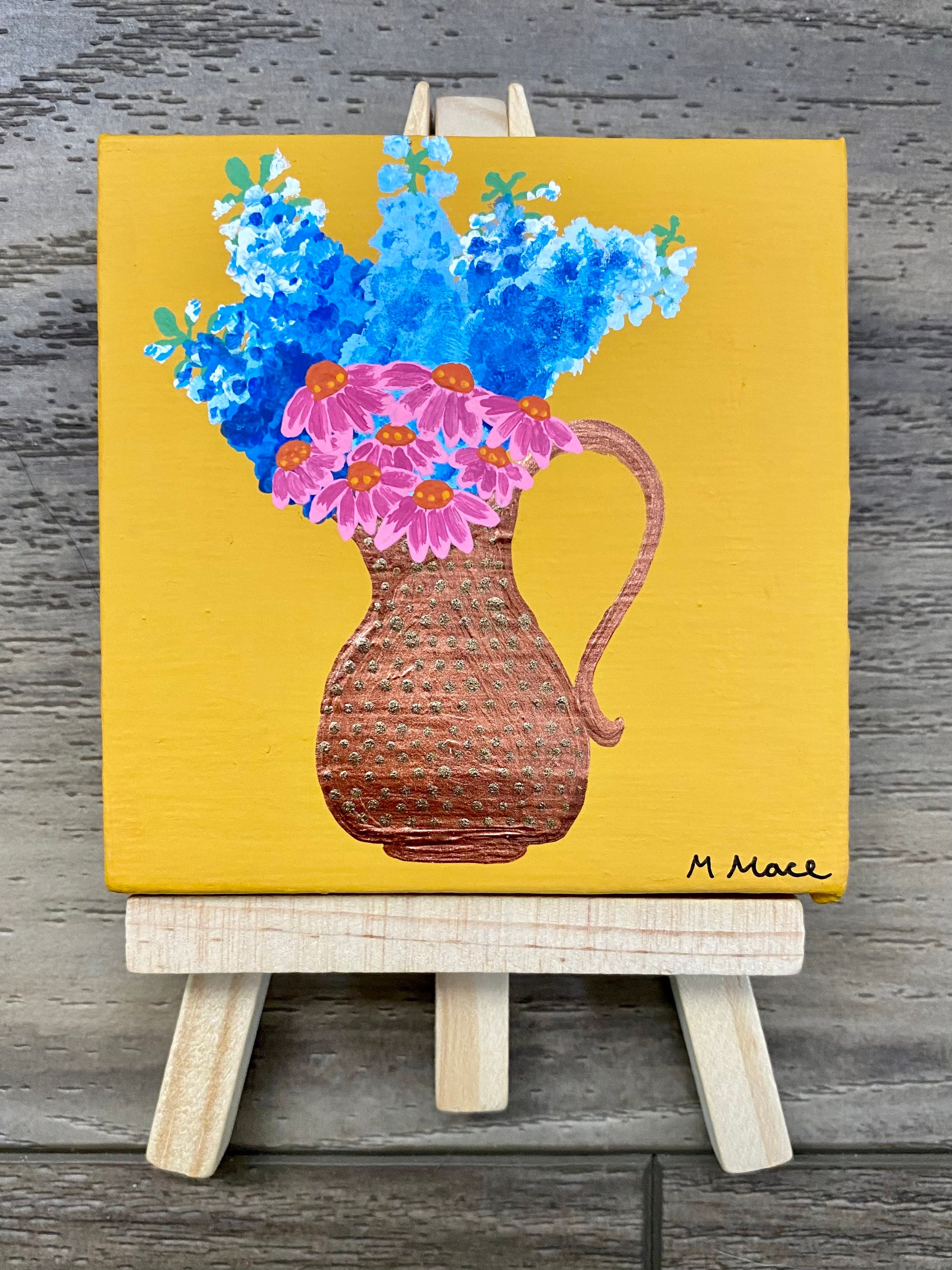 A bouquet of delphiniums and coneflowers fill a hammered copper pitcher set against a mustard yellow background in this miniature acrylic painting. The copper pitcher was made with several shades of metallic paint that really shine and the “hammered” look gives the piece interesting texture. The 5 inch tall wood easel displays the 3x3 inch canvas perfectly without a frame!