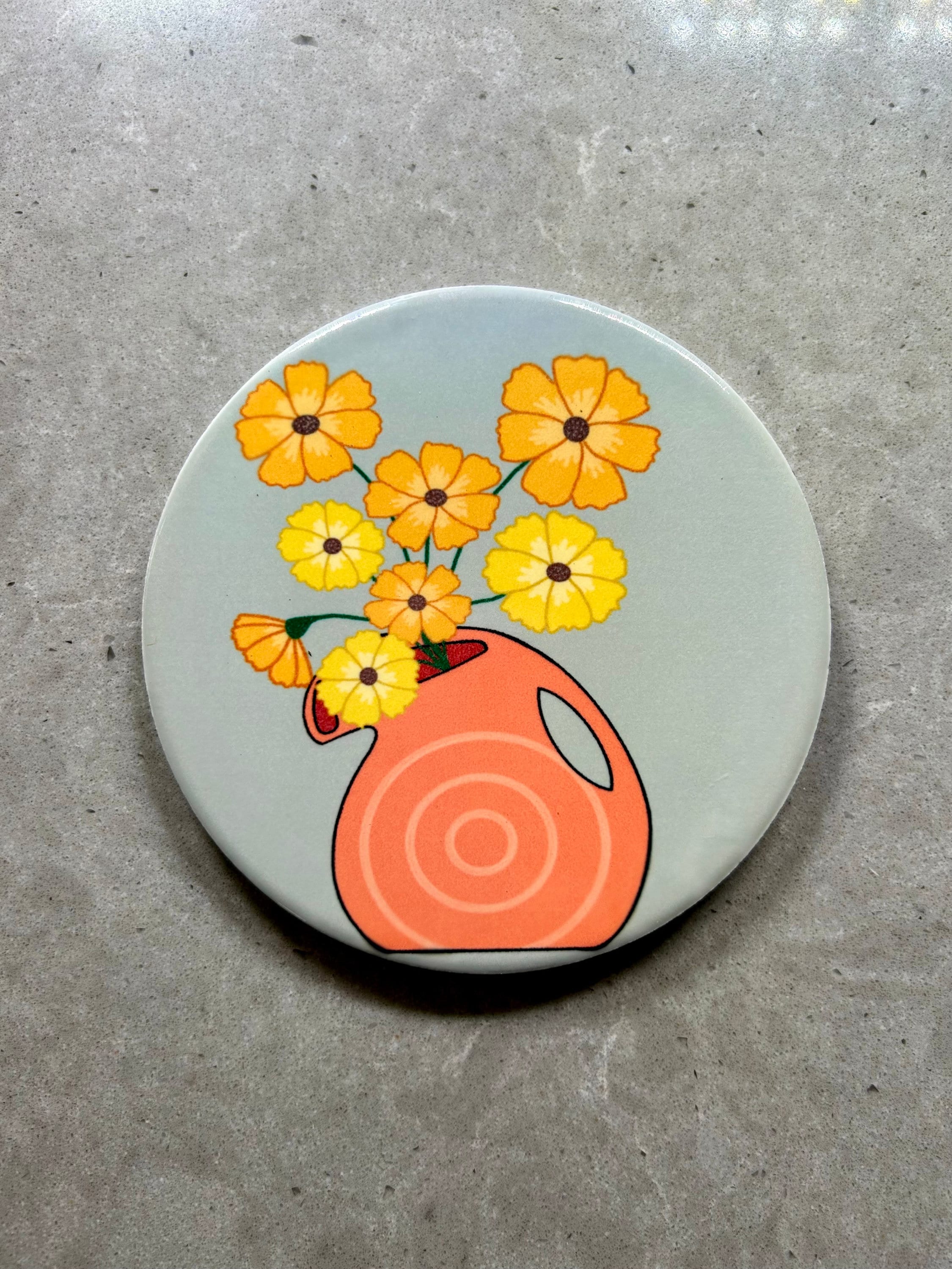Beautiful set of floral bouquet coasters, perfect for brightening up any table for yourself or as a gift for others! Each coaster has a different bouquet of flowers in a colorful kitchen vase, set against a neutral background. Although these coasters are pretty, they are not just for decoration! The coasters are made of durable waterproof ceramic with a cork backing to protect table surfaces. Cheers!