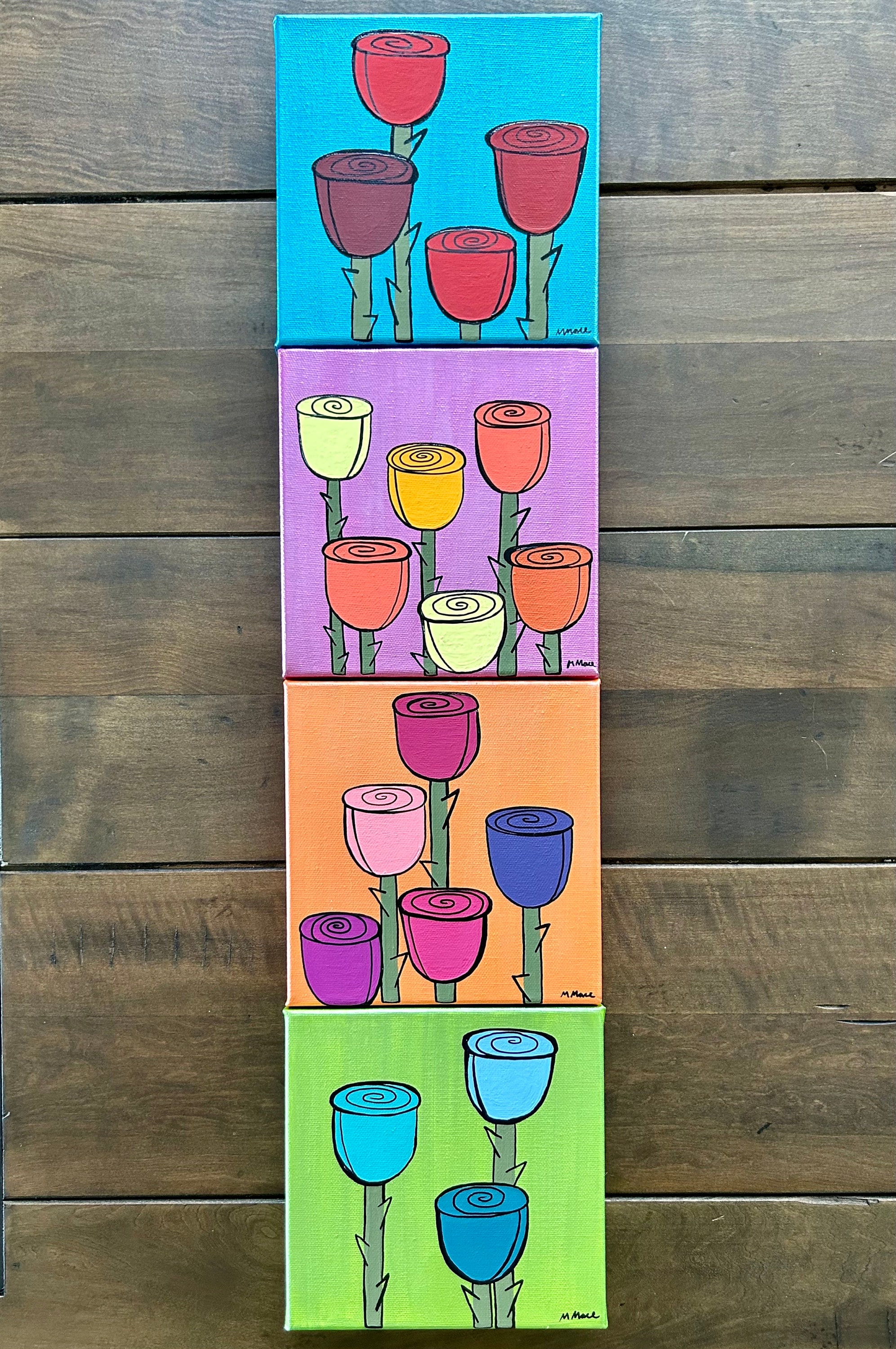 Add some color to your space with this set of four paintings! Each canvas features a different group of stylized roses set against a metallic background. The flowers are painted in a matte finish with alcohol ink details that pop against the shiny metallic paint, giving each interesting texture and dept. The canvases measure 6”x6”x3” and have painted edges for display with or without frame!